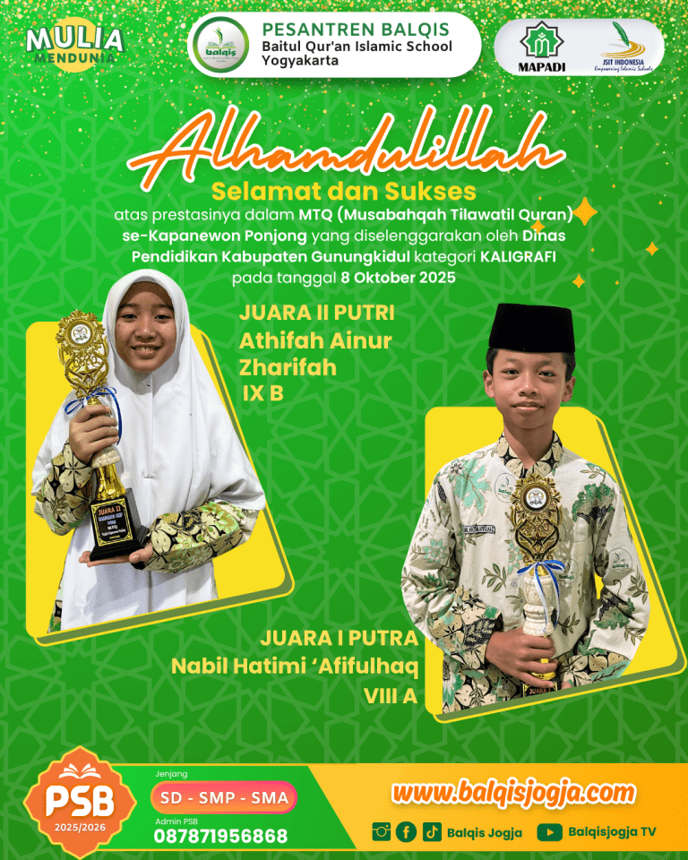 Sebagai bagian dari upaya menumbuhkan kecintaan terhadap Al-Qur’an serta mengembangkan potensi seni Islami, kegiatan Musabaqah Tilawatil Qur’an (MTQ) tingkat Kabupaten yang dilaksanakan pada 8 Oktober 2025 menjadi ajang prestasi yang membanggakan. Pada kategori Kaligrafi, para peserta berhasil menunjukkan kemampuan terbaiknya. Juara 1 diraih oleh Nabil Hatimi Afifulhaq, sedangkan Juara 2 diraih oleh Athifah Ainur Zharifah. Prestasi ini mencerminkan ketekunan, kreativitas, serta dedikasi tinggi dalam seni kaligrafi Al-Qur’an, sekaligus menjadi motivasi untuk terus meningkatkan kualitas dan prestasi di masa mendatang.